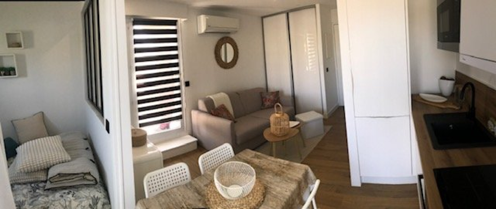 Très bien équipé avec climatisation , lave linge ,lave vaisselle, frigo congélateur,micro onde , four ,cafetière DOLCHE GUSTO ,plaque induction 2 feux, plancha