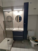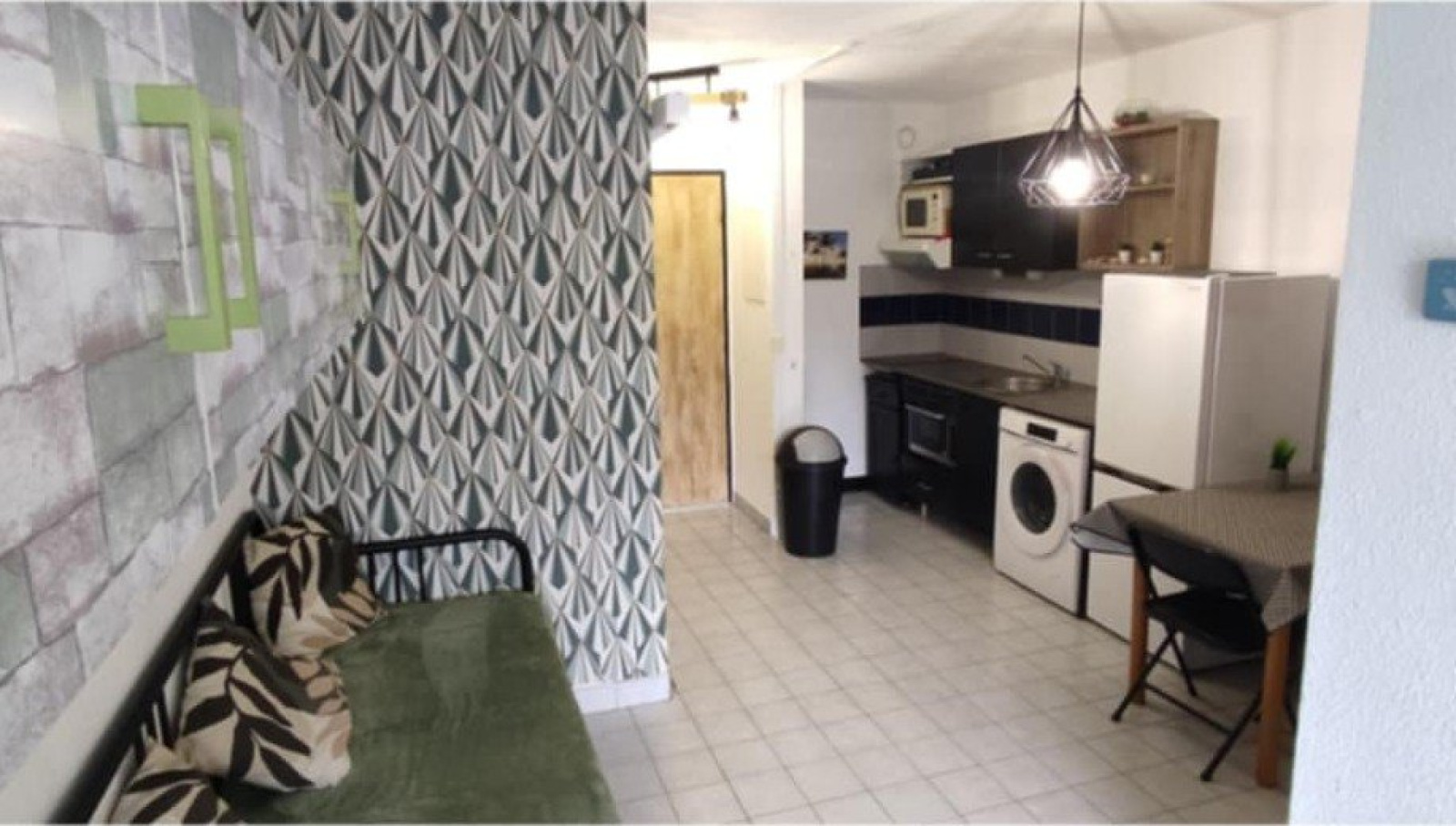 Coin cuisine avec lave linge , frigo congélateur , plaque induction 2 feux , micro onde , mini four , cafetière filtre , bouilloire électrique .