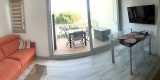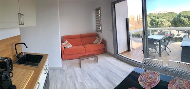 Composé d une cabine à l'entrée , salle d'eau avec wc , séjour avec coin cuisine , terrasse avec table et chaises .